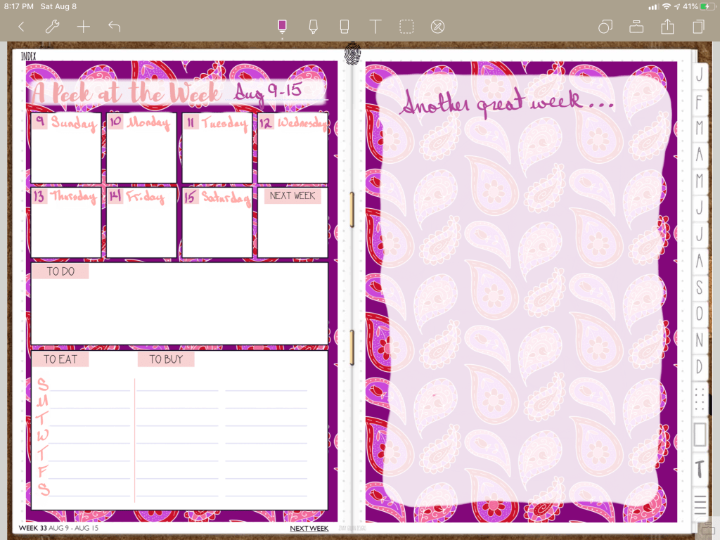 Open your favorite planner in a writing app. I prefer to use the Noteshelf app for planning. Add in some colorful PNG stickers to use as a background. Lock the images in place so the new images over top don’t interfere with the ones below. Use a white highlighter to add a “shadow” so that the words on the left side of the image stand out. The weekly image on top was cut, then pasted over the highlighter. Use the highlighter in layers to form the overlay on the right side of the image. Then, simply write in your week! Super easy!