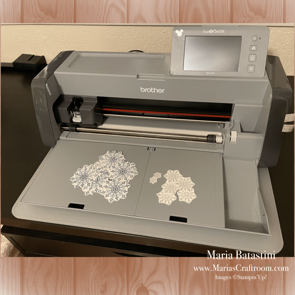 Hi everyone! Today we’re using the Brother Scan N Cut to cut out snowflakes! I was making my Christmas cards from last week’s video assembly line style, and decided to add snowflake cut outs. I totally forgot to buy the frames that came with this Joyful Flurry cling stamp set (1598014). It’s a good thing I have a Scan N Cut to do that cutting for me. I ended up cutting 50 each of the large, medium and small snowflakes in minutes. Took me longer to stamp them than it did to cut. I suggest you make one to make sure you like it. Then do the cutting all at once, and put them all together.