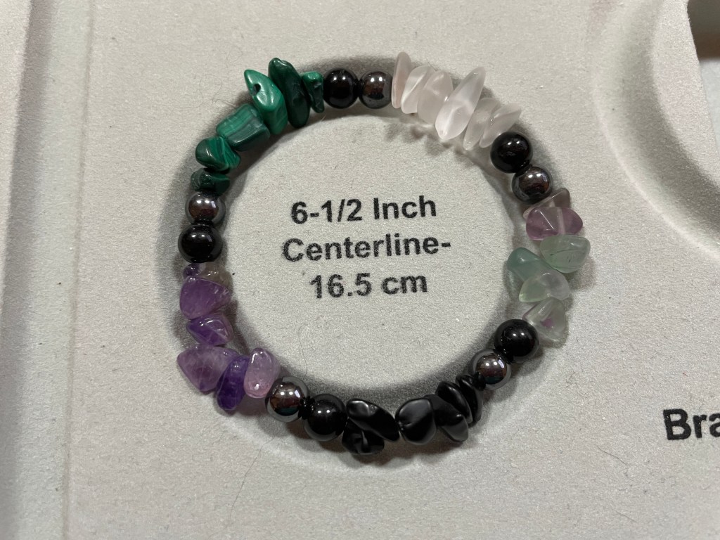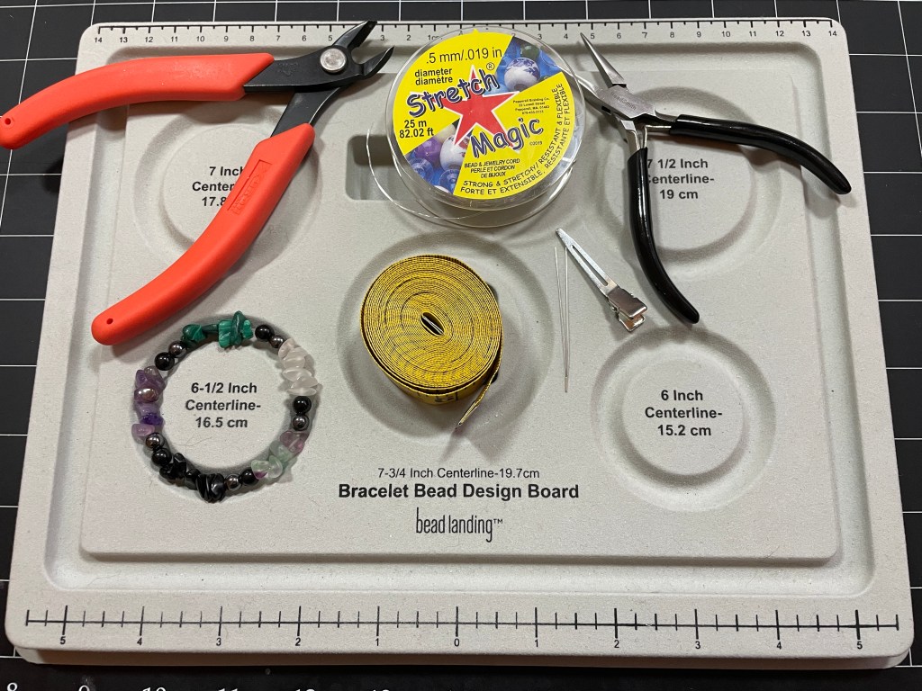 First, you’ll want to measure your wrist, or the wrist of the person you are making for. Gather your supplies and decide on a pattern for the bracelet. Lay out the beads in the handy bead board to make sure you like the design. I used 6mm round Hematite and Black Tourmaline, and chips of Clear Quartz, Fluorite, Obsidian, Amethyst and Malachite.