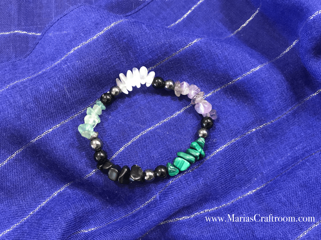 Hi this is Maria. Today we’re making a cute stretch bracelet from natural stone chips! I needed some quick last minute gifts and this project is so easy that I made several. A quick trip to the craft store is in order! Select the beads you want to use and pick up any supplies you don’t already have. I had these stones on hand since I was duplicating one that I made for myself a while ago.