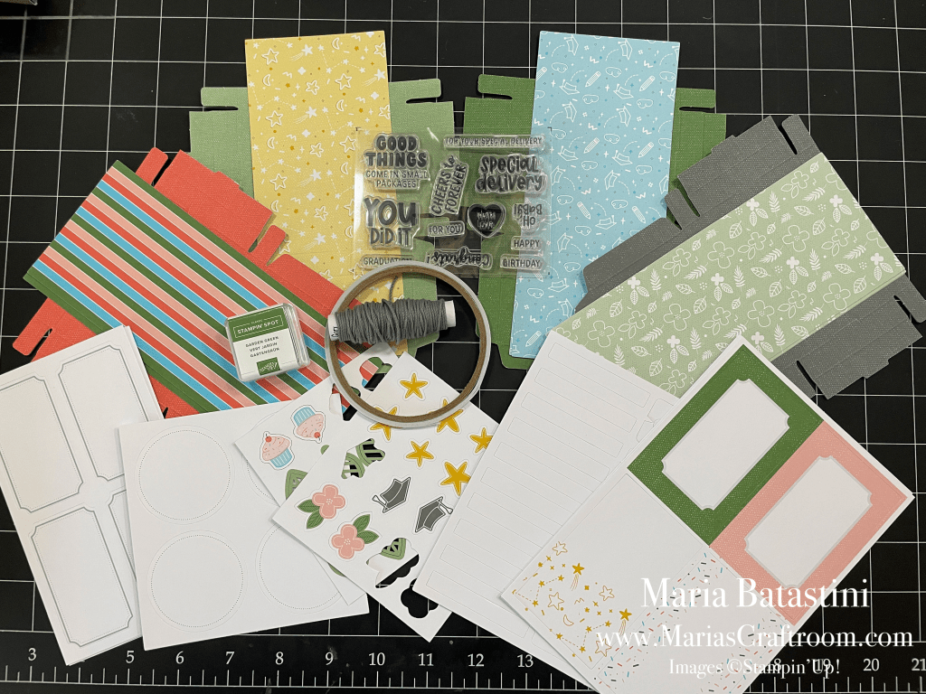 These fun little boxes are big enough to fit a gift card or a small gift. You will find included pre-scored boxes, belly bands, string, labels, fun embellishments, and stamps. Also, full color instructions come in each box.