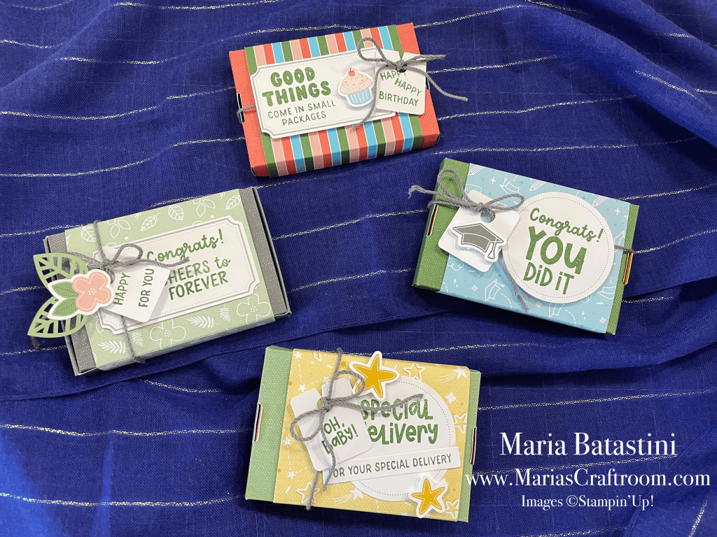 You may follow the instructions provided or Chose Your Own Adventure to mix and match with other products. In this case, I’ve followed along to make the boxes as shown. First fold all the pre scored areas to fold the box into shape. Fold along on the belly band and secure it around the box using Tear N Tape being careful to not make the band too tight. It needs to be able to go on and off the box. Next, find all the pieces needed for each box. Stamp the sentiments on the tag. Use Stampin Dimentionals to attach the pre stamped embellishments onto the tags. Use the thread to go around the bellyband and secure it with a simple bow. Finally, attach the sentiment tag onto the box. Done!