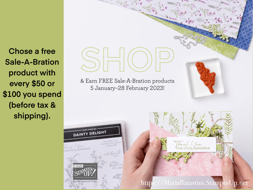 The Day at the Farm DSP paper is so whimsical! This paper was free with purchase from the annual or Mini Catalog. You may chose a stamp set or paper pack from the Sale-A-Bration Catalog when you place an order and spend $50 or $100 (before tax & shipping). Click here for more info.