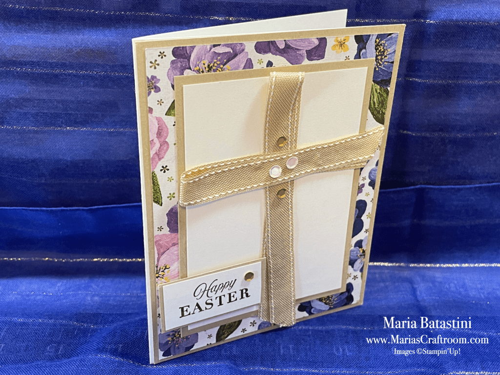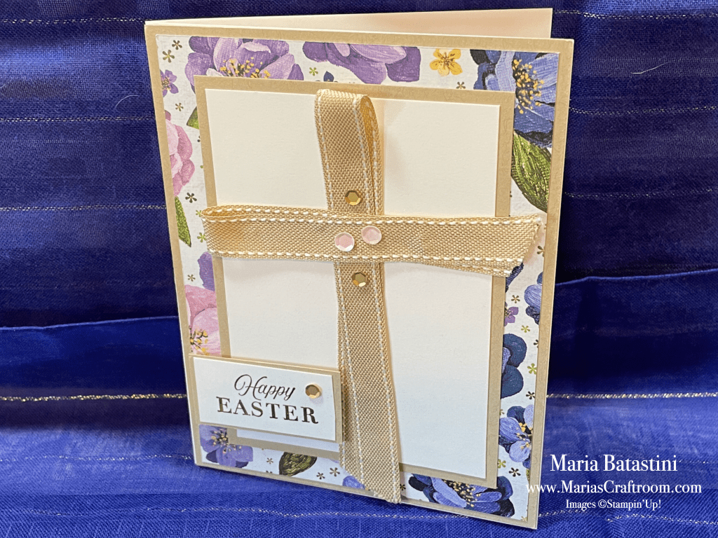 Hi this is Maria. Today we’re making an easy Easter Card using ribbon and beautiful Designer Series Paper. I love using what I have. So, since I didn’t have a cross die or stamp, I decided to create one from ribbon.