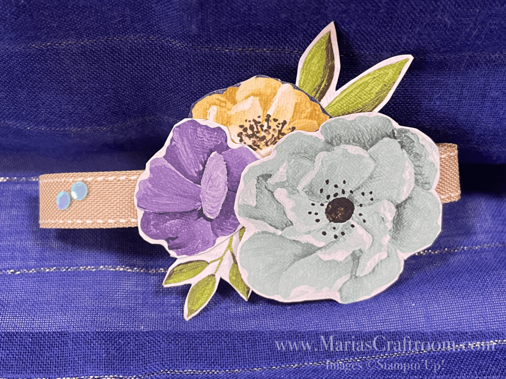 - Use Stampin’ Seal to adhere the smaller flowers to the Burlap Ribbon slightly behind the larger flower that is higher on dimensionals. Use liquid glue to reinforce these onto the ribbon if necessary.
