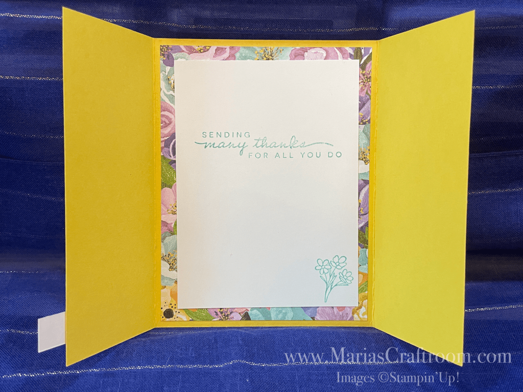 Hi this is Maria. Today we’re making an easy Gate Fold Card. We’ll be using the retiring Hues of Happiness Designer Series Paper, and retiring Happiness Abounds Stamp Set. I love this paper! So sad to see it retire, but I will continue to use it and the other retiring products as much as I can. That way, you can see them in action while you can still get them.