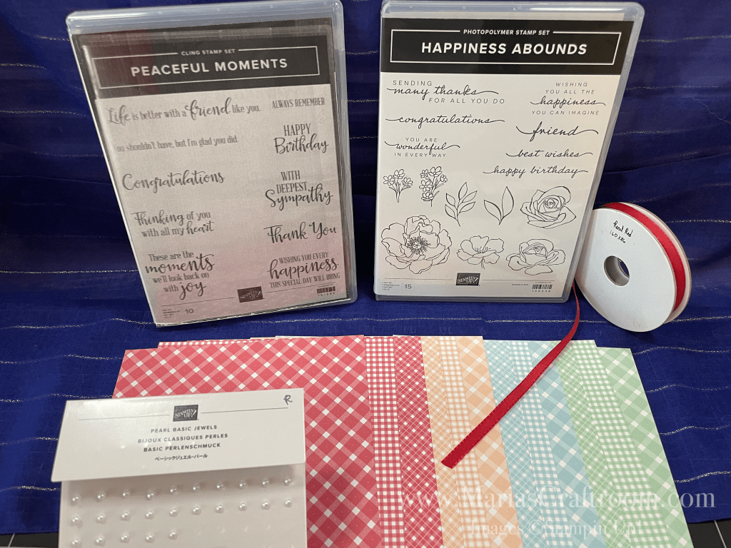 Hi this is Maria. Today we’re making an easy birthday card using some retiring 6 x 6 Gingham Designer Series Paper. I love using colors that go together! So, we will be using a pop of color with the Real Red Ribbon (not retiring). I also like to mix and match stamp sets to get just the message I want to convey. In this case, we’ll be using “happy Birthday” from the Happiness Abounds Stamp Set, and “Life is better with a friend like you” from the Peaceful Moments Stamp Set. Finally, we’ll put a finishing touch with Pearl Basic Jewels. Most of these items are RETIRING soon!