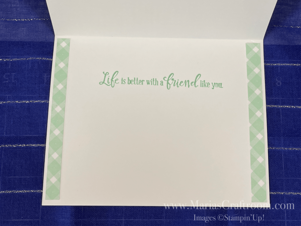 - Stamp “Life is better with a friend like you” from the Peaceful Moments Stamp Set centered on the inside of the card.
