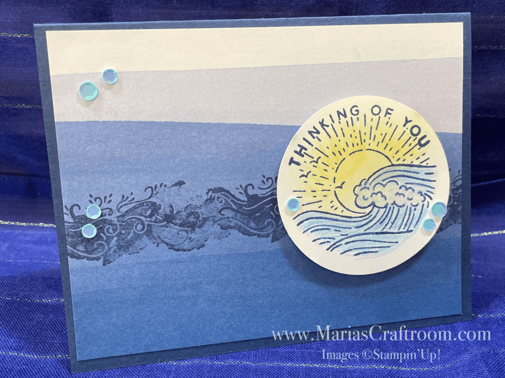 - Use Night of Navy Ink to stamp the image of waves and sun onto the center of the circle, and “Thinking of You” from Circle Sayings stamp set to the top of the circle.