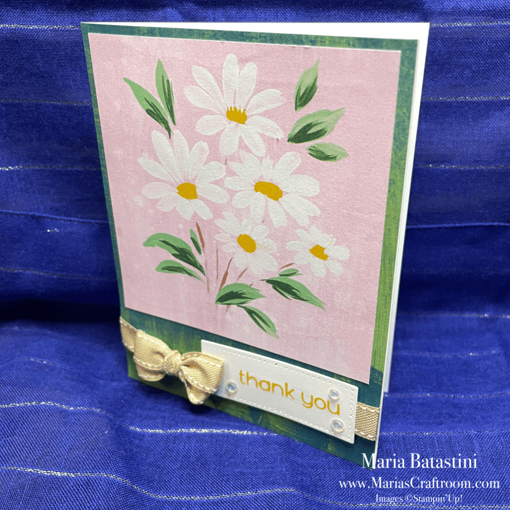 Hi this is Maria. Today we’re making a beautiful Thank You card using Timeless Arrangements stamp set and Dies, along with Fresh as a Daisy Designer Series Paper. We’re also going to learn how to make a perfect wrap around attached ribbon bow!