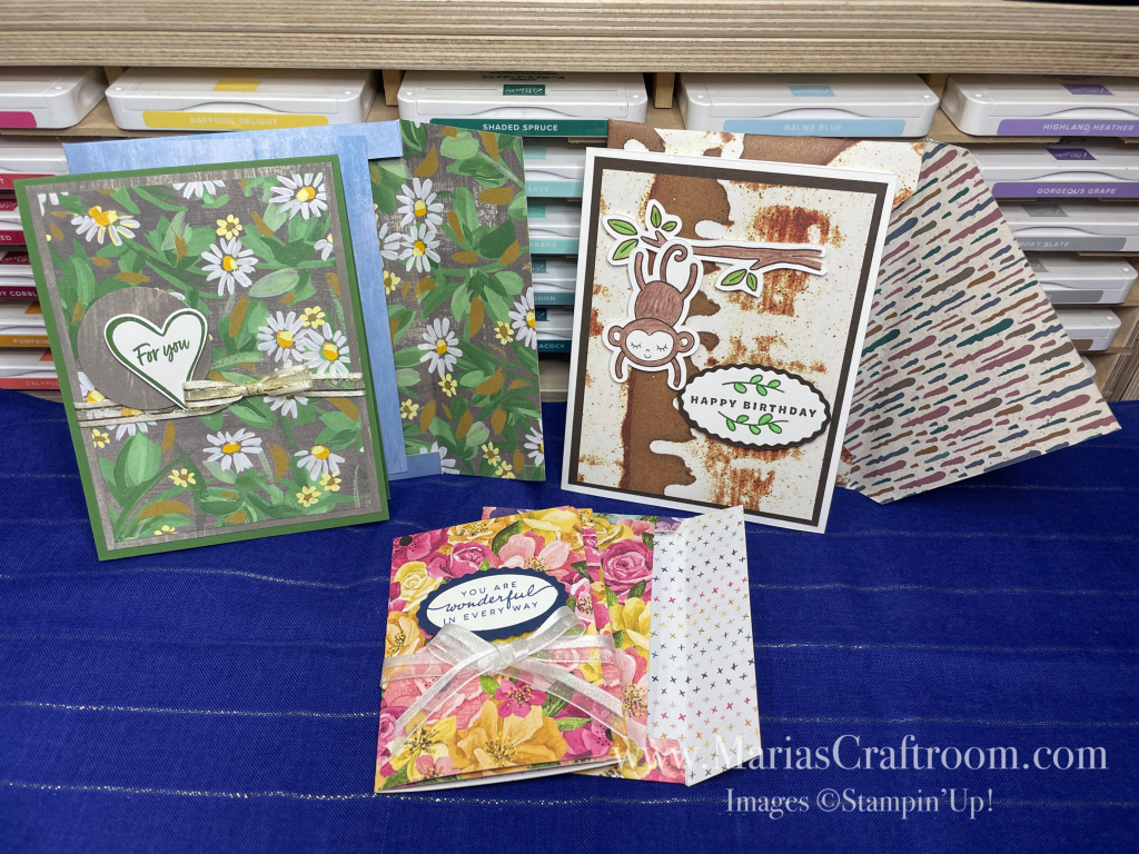 Hi this is Maria. Today we’re making custom envelopes for our cards with matching Designer Series Paper. I’ll show you a triangle flap as well as a rectangle flap type envelope. We’ll be learning how to measure any card in order to be able to make an envelope for any size card. The principles are the same.