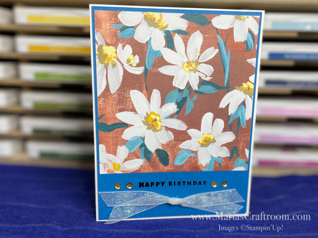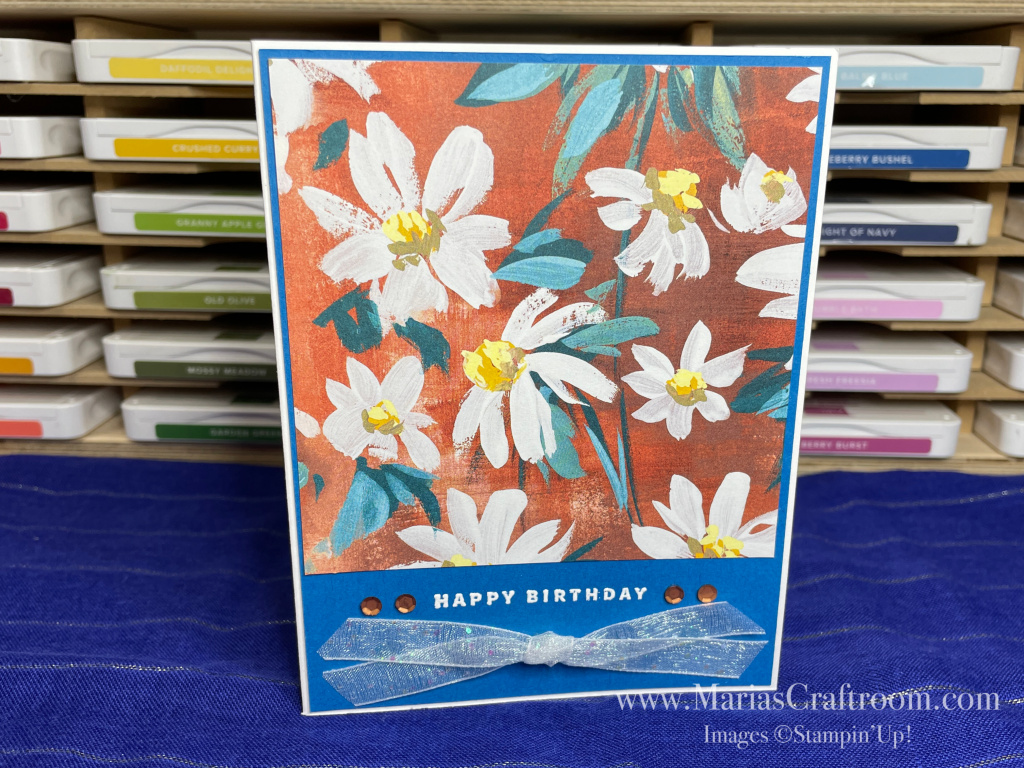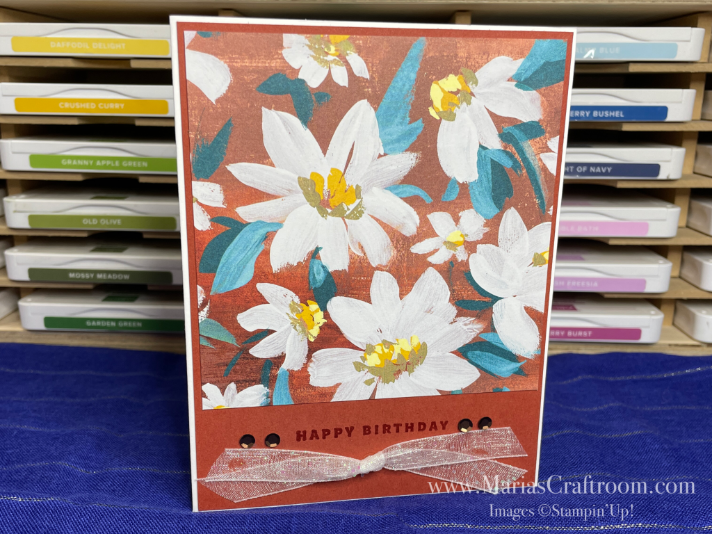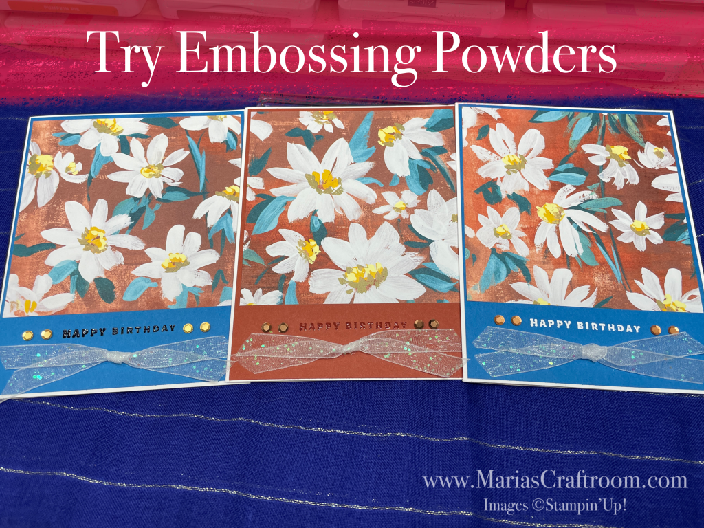 Hi this is Maria. Today we’re making a beautiful card showing off embossing powders. I’ll show you how to use embossing powder to make your cards really stand out. We’ll also use the Something Fancy stamp set and Fresh as a Daisy Designer Series Paper. If you don’t know how to make a bow, just make a knot and go with it.