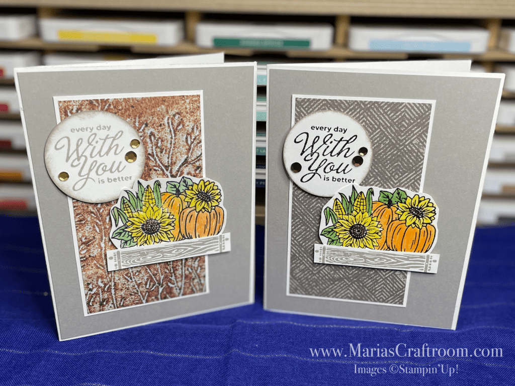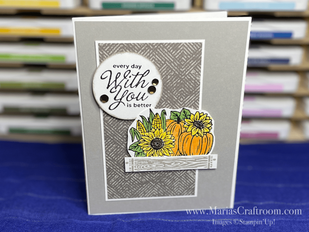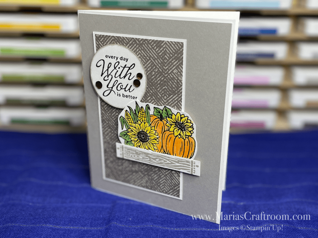 Hi this is Maria. Today we’re using Water Color Pencils and a Blender pen to easily color some fall images. I love to color! If you’re looking for a cost effective way to get beautiful color, then colored pencils are a good way to go. We’ll be using Rustic Crate Stamp Set and Earthen Elegance Designer Series Paper to make this easy card.