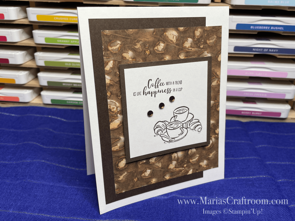 Hi this is Maria. Today we’re making such an easy card using up some scraps. I’m trying out a new stamp set called “Coffee with Friends”. This style of stamp always makes me think of my sisters, and I tend to buy them up!