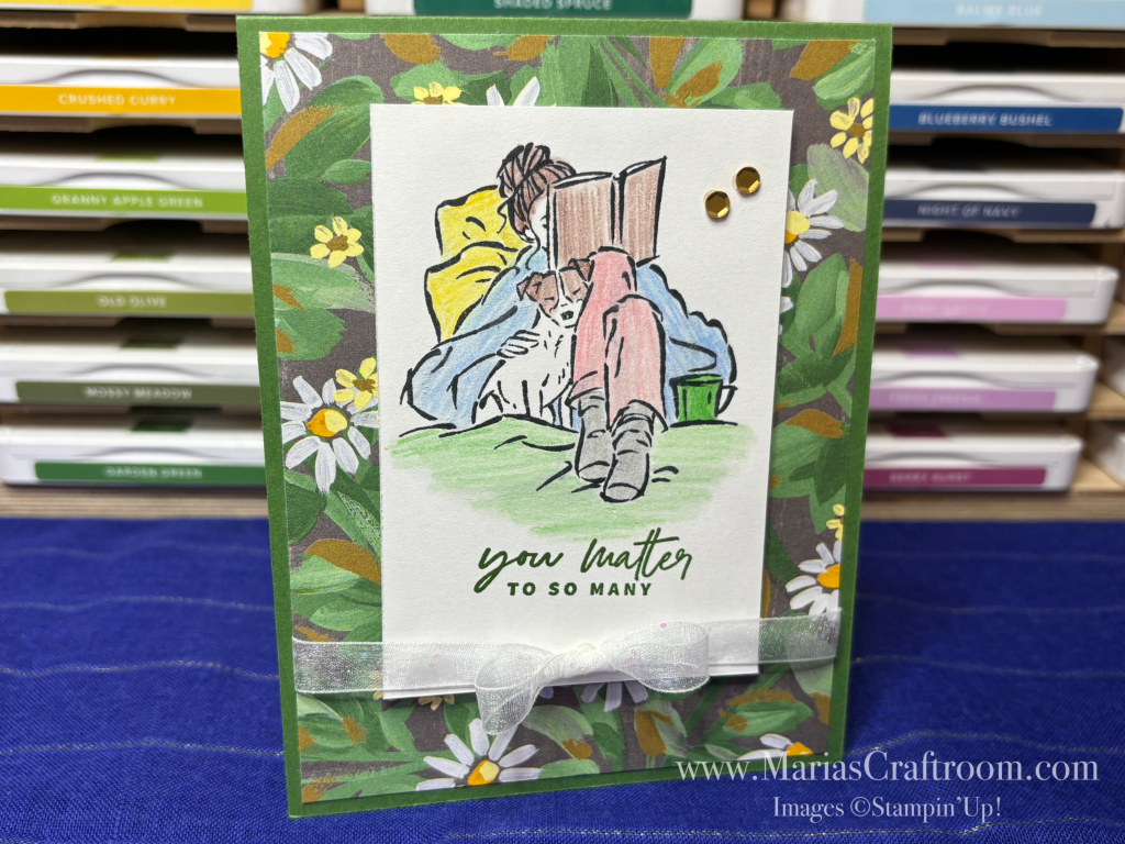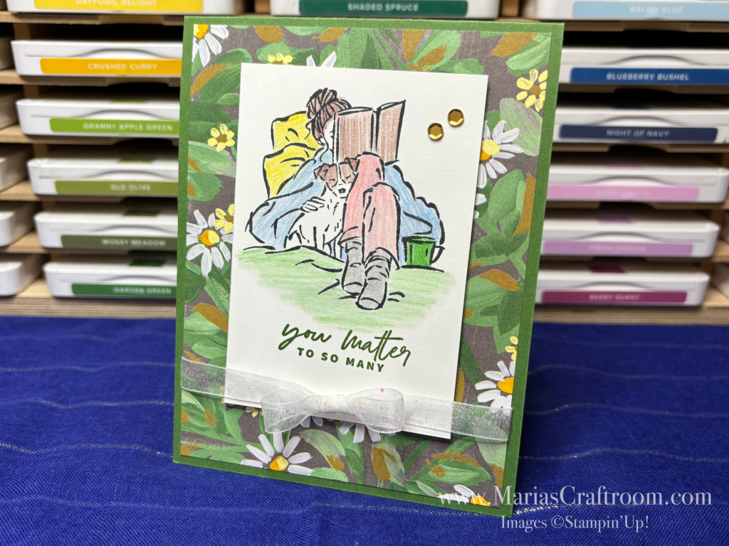 Hi this is Maria. Today we’re illustrating the importance of self care. We sometimes get so wrapped up in life or grief, that we forget to take care of ourselves. I’m making this card to remind us to enjoy the little moments of each day. I’m using “In the Moment” and “Something Fancy” Stamp Sets as well as “Fresh as a Daisy” Designer Series Paper.