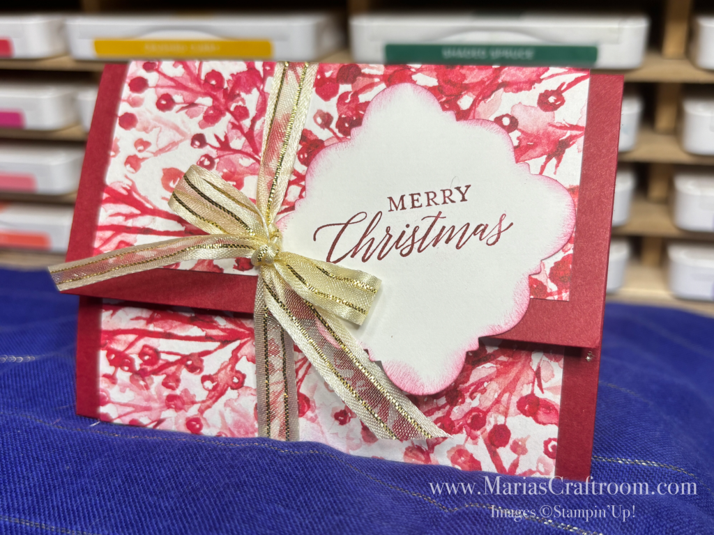 Hi this is Maria. Today we’re making a beautiful gift card holder and card combination. Lets dress up that gift card with some lovely Christmas paper.