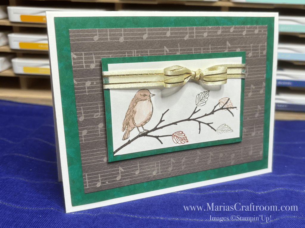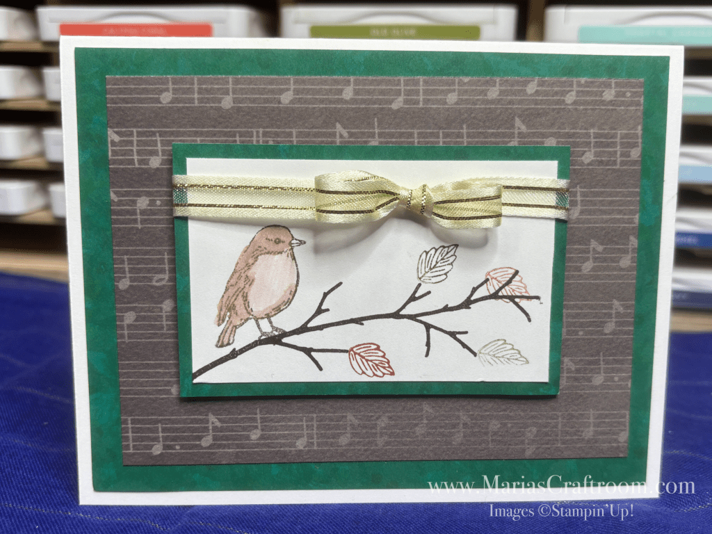 - Use Early Espresso to stamp a bird onto the mat first, then stamping onto the branch. This will lighten the image.