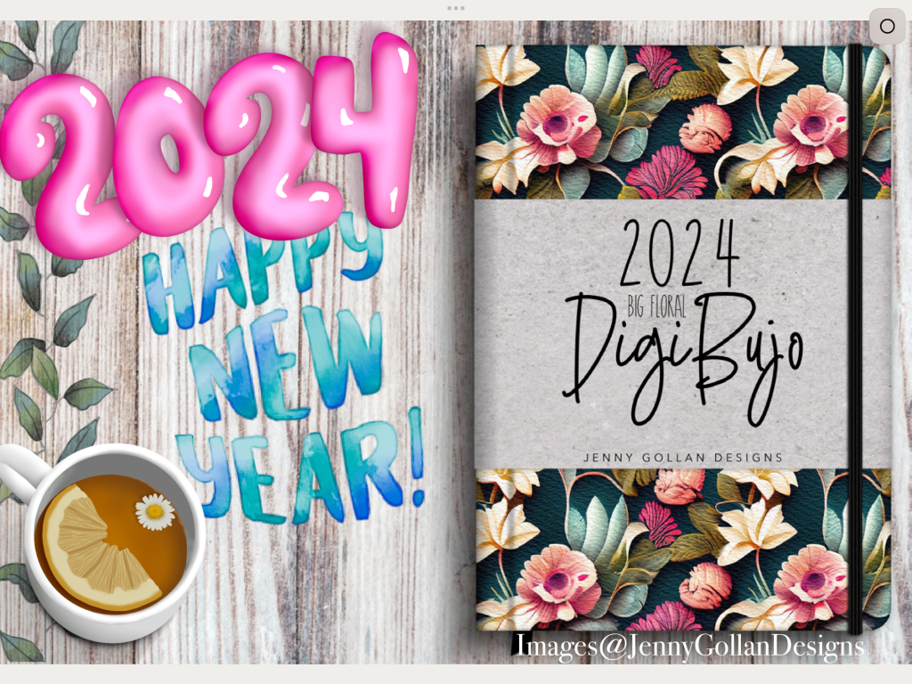 I’m talking about my favorite digital bullet journal and planner by Jenny Gollan Designs, the DigiBujo. I got the Big Floral 2024 DigiBujo, but there are other options in her shop. I get at least one of her journal/planners every year because they’re completely customizable. This style of planner gives me the flexibility to make it work the way I need it to work, without having to make a planner myself. It is a bullet journal style planner, so you can hand write or draw in it, or add ready made images to make it exactly as you would like.
