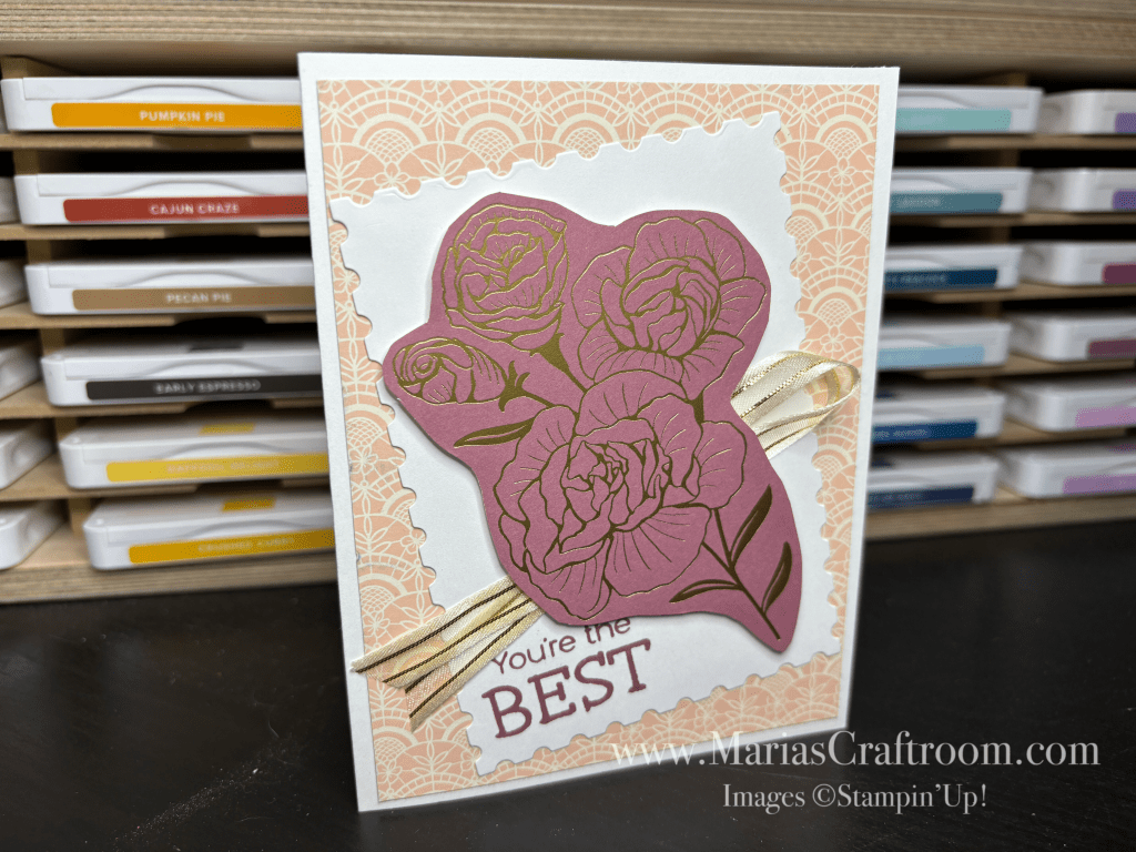 Hi this is Maria. Today we’re making a lovely birthday card. I’ll be using Perennial Postage Dies, Hooray for Surprises Stamp Set, and Forever Love Designer Series Paper.