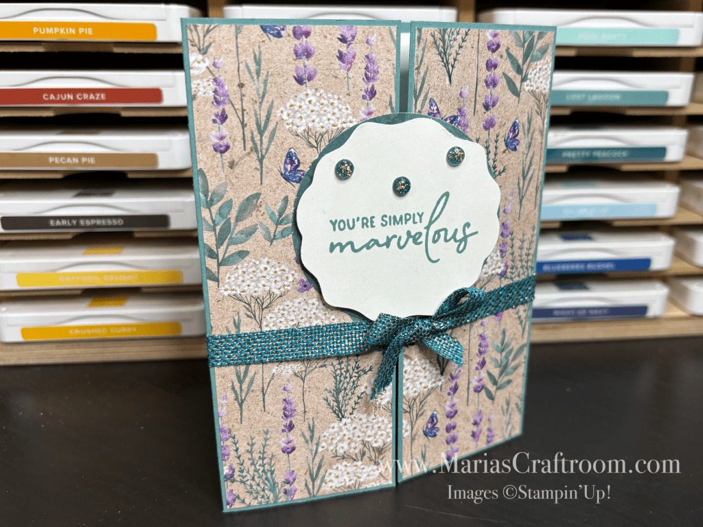 Hi this is Maria. Today we’re making a stunning Thank You Card in the shape of a Gate Fold. These look so fancy, but they’re so simple to make. We’re Using the paper and stamp stet from the Perennial Postage Suite, and the ribbon and gems from the Forever Love Suite. They match very well!